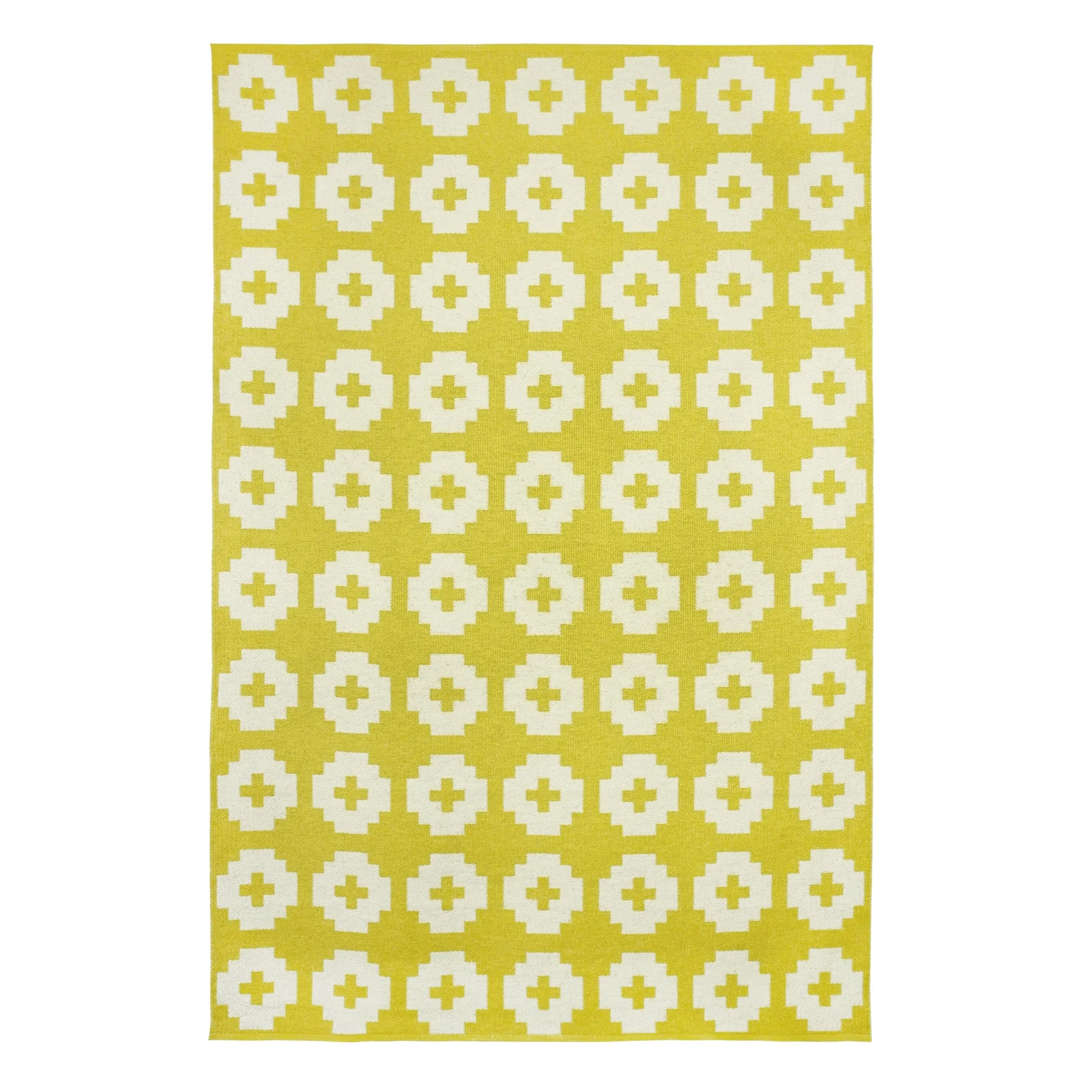Het grote Flower vloerkleed zon van Brita Sweden is een zacht kunststof kleed – geweven volgens oude Zweedse weeftradities – met een grafisch bloemenmotief in felgeel en wit. Het omkeerbare patroon zorgt ervoor dat u het kleed aan twee kanten kunt gebruiken! Een kleurrijk detail voor de woonkamer of keuken, die nóg beter tot z’n recht komt met andere interieuraccessoires in dezelfde kleur.